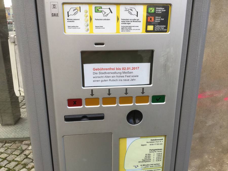 Парковка на одной из центральных площадей бесплатна до второго января. «Городская администрация Майсена жилает всем радостного праздника и счастливого Нового Года» — примерно так.